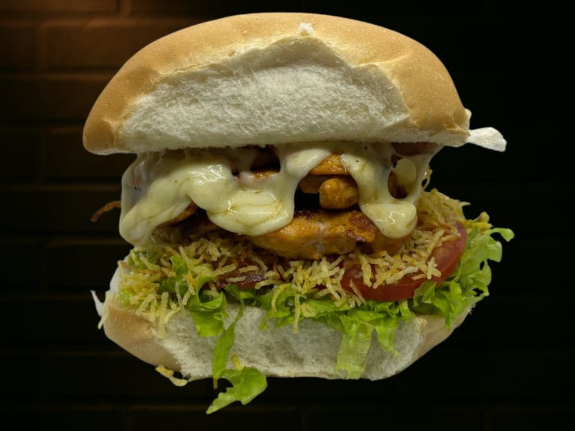 Frango suculento e hambúrguer na chapa, cobertos com queijo derretido e batata palha crocante. Alface e tomate completam esse lanche que é puro equilíbrio entre sabor e textura!
