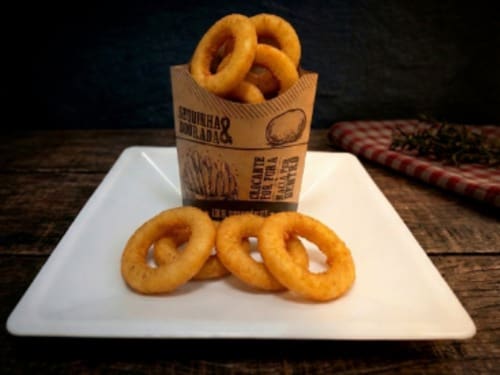 Nossos clássicos anéis de cebola empanados. Porção generosa com 12 unidades fritas na hora.