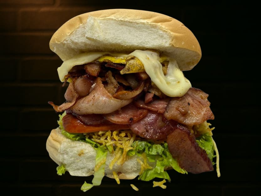 Duas salsichas bem servidas com bacon crocante, calabresa saborosa, ovo na chapa e queijo derretido. Milho e batata palha dão o toque especial, e a salada entra com alface e tomate pra completar o espetáculo!