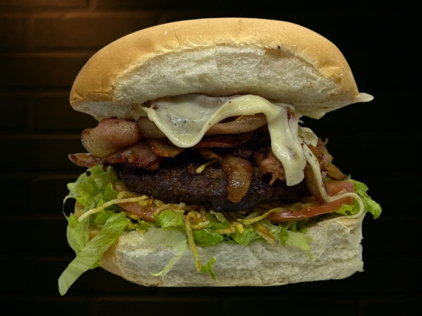Bacon e hambúrguer juntinhos, queijo derretendo e batata palha pra fazer aquela festa na mordida. Com alface e tomate pra fechar com estilo!