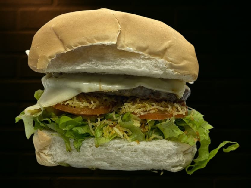 Tem salada, tem batata palha, tem hambúrguer e queijo... Tudo no ponto certo pra matar a fome com estilo!