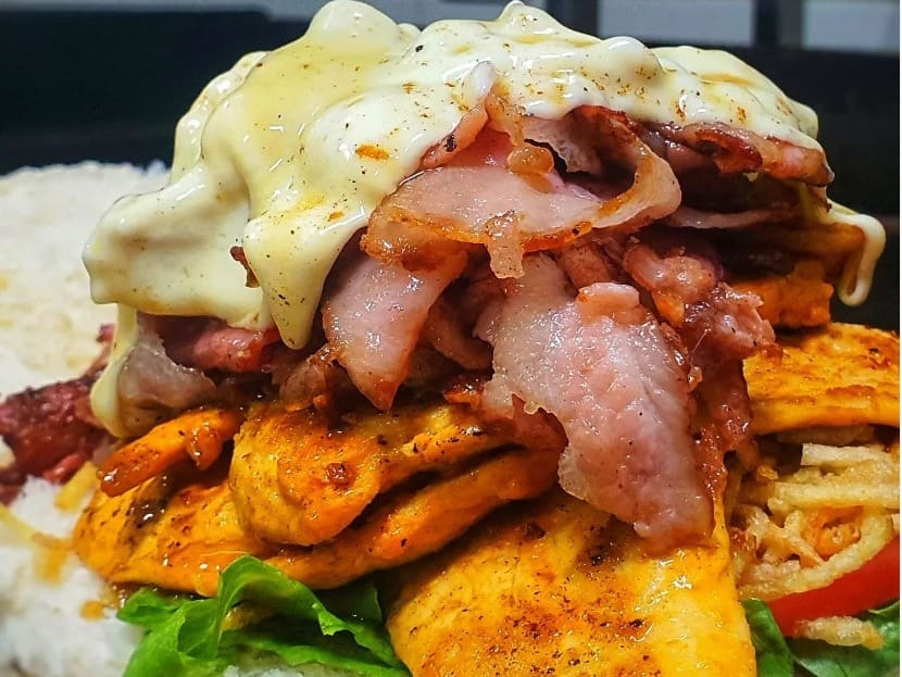 Frango e bacon juntos, queijo derretendo e batata palha crocante… e ainda vem saladinha pra fechar a mordida com equilíbrio. É lanche pra comer feliz!